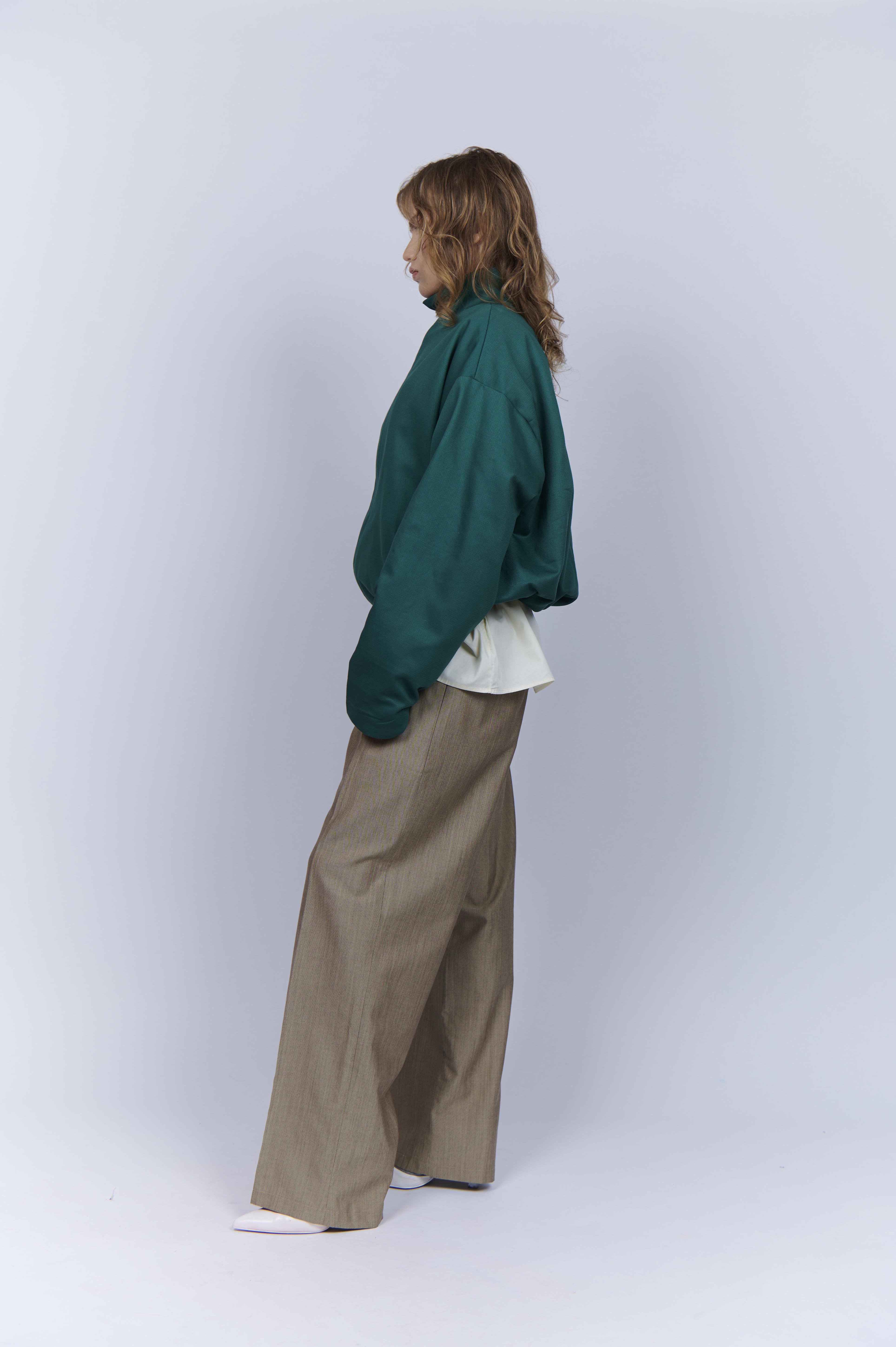 Tiene dos bolsillos profundos escondidos en las costuras de los laterales, amplitud en el medio de espalda y mangas con pliegue hacia el frente.